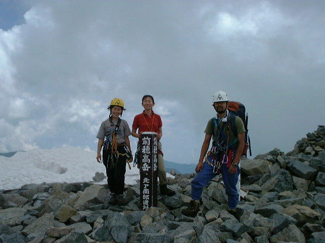 <登攀終了後、前穂の頂上で。見にくいが、左後方に残雪が確認できる。>