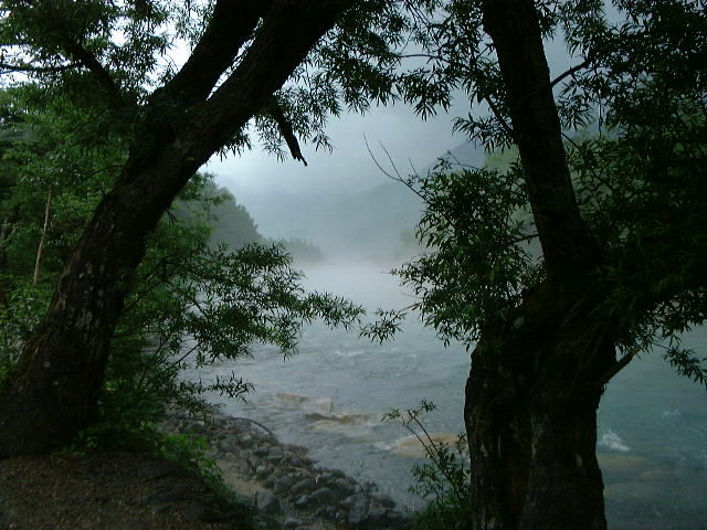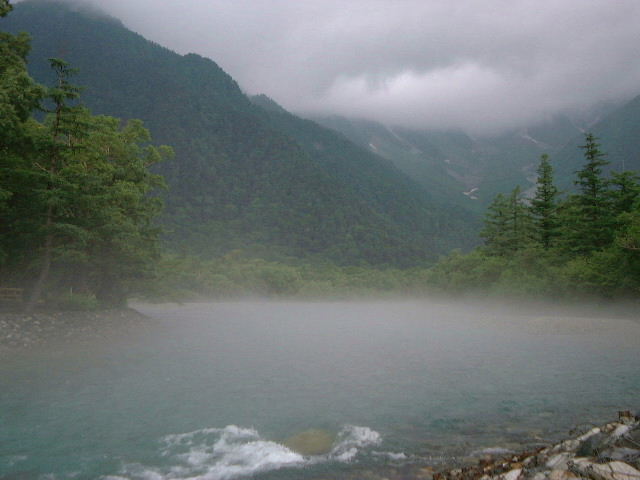 その時は丁度雨上がりで、気圧が変化するせいか梓川一面に霧が覆っていた。まるで霧の中から水が流れ出してくるようだった。