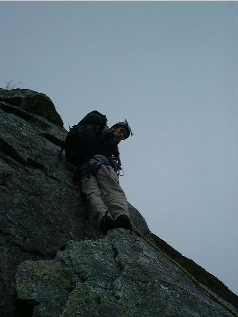 <下り坂にの天気の中、4尾根をリードする山さん>